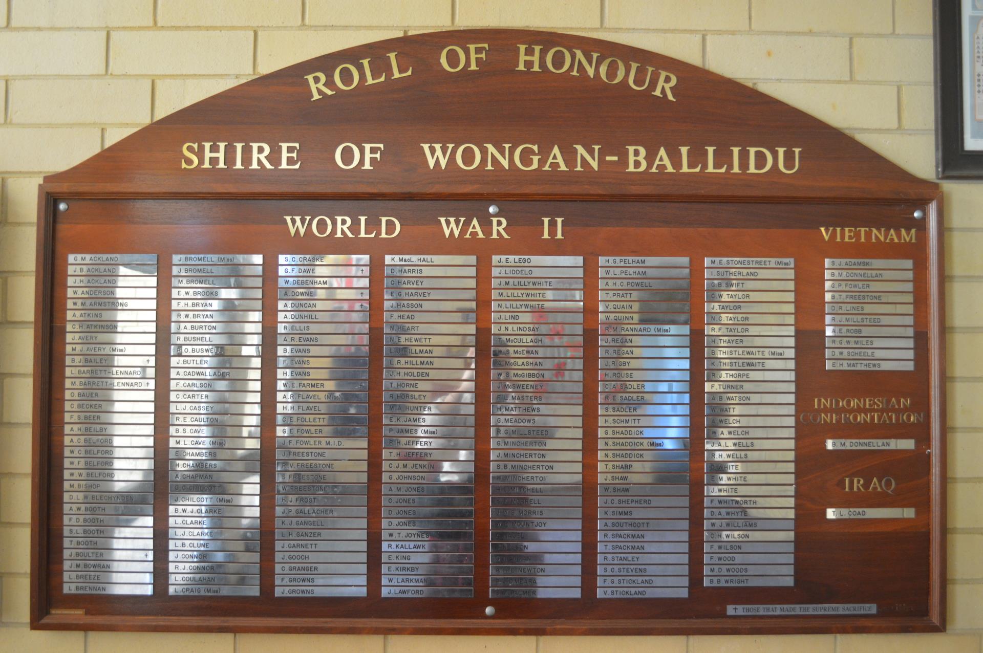 Located within the grounds and foyer of the Wongan-Ballidu Civic Centre are a number of plaques and memorials commemorating those who have served our country. Many of the individuals honoured made the ultimate sacrifice in the course of their service, and all are remembered with the utmost respect and gratitude.